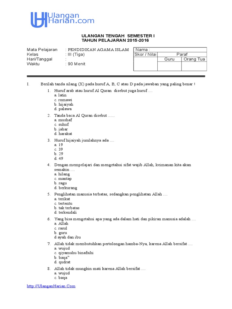 Soal pts pai kelas 3 semester 2 dan kunci jawaban k13. By soalbagus 23 jan, 2020. Semoga anak didik anda akan berhasil dengan nilai yang maksimal dan menjadi generasi penerus yang handal dan berkualitas serta berakhlaqul karimah. Aug 10, 2020 · contoh soal 1 soal pts pai kelas 3 ganjil k13.doc, unduh contoh soal 2 soal pts pai kelas 3 ganjil k13.doc, unduh demikianlah soal uts/ pts pai dan budi pekerti kelas 3 sd/mi semester ganjil kurikulum 2013 yang dapat kami bagikan, semoga bermanfaat untuk kita semua. Ujian akhir semester bisa menjadi dasar penilaian gruru tehaap kemampuan siswanya seberapa mampu mereka menyelesaikan pelajaran yang hampir berjalan tiga bulan tersebut.